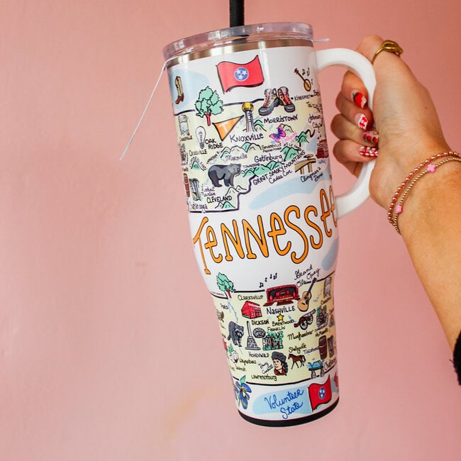 These one-of-a-kind designs by Fish-Kiss display what makes Tennessee special. Hydrating has never been easier with our 40oz Insulated Mega Mug! A cup holder-friendly frame, a comfort-grip handle, and a plastic straw with a silicone flexi-tip.