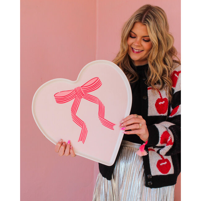 This heart-shaped tray is perfect for your Valentine's Day festivities. Made of bamboo, it features a charming bow design. Serve your loved ones in style with this unique tray that is both functional and adorable.