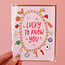 Lucky to know you! This charming card shows a lucky charm bracelet with every lucky charm you can possibly imagine. Perfect for Valentine's Day, a birthday, or just because!