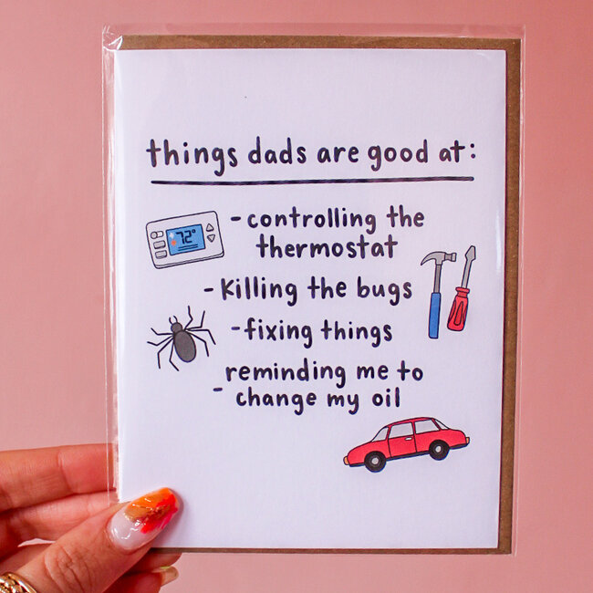 We all know what Dads are good at! Whether it's fixing something or telling you when you need to change the oil in your car, Dad knows what to do! The sweetest card for Father's Day, your Dad's birthday, or just everyday!