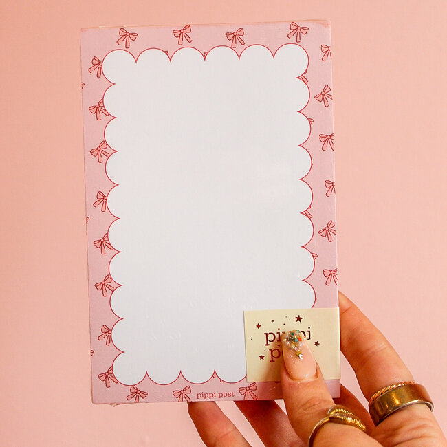 The scalloped edge and dainty bow border bring just the right touch of girly, flirty fun to your desk or planner. Whether you’re a list-maker, doodler, or gifting to a stationery-loving friend, this notepad is ready to brighten up your everyday scribbles. Perfect for coquette-core lovers, pretty desk setups, and thoughtful gifting! Features: 52 sheets, blank, chipboard backer Size: 4×6"