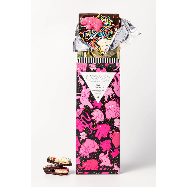 Pink Elephant Dark Chocolate + Animal Cookies chocolate bar! These bars combine signature dark chocolate with the iconic animal cookies and sprinkles, and are edible works of nostalgic art sure to take you back to your childhood!!