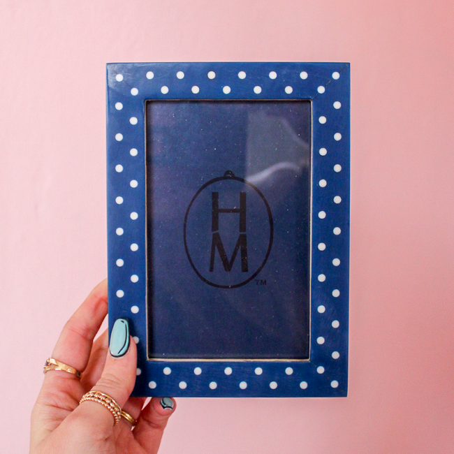 Bring a fun playful touch to your desk or mantel with this navy blue frame! Featuring a crisp white polka dot pattern, this frame provides a bold, classic backdrop for your favorite memories!!
