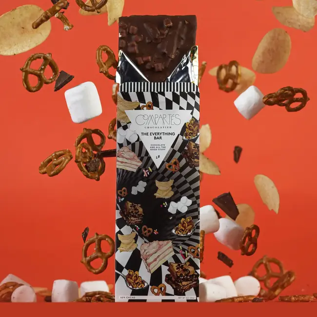 Everything you can dream of in one bite. For the one who has everything, this bar has everything & more!! Cake, sprinkles, marshmallows, pretzels, rainbow sprinkles, this is decadence and indulgence combined into a mindblowing chocolatey burst of flavors from all the Compartés classics. This is literally chocolate + all the good stuff in one scrumptious bite. Everything you need for that sweet treat, all rolled into one.